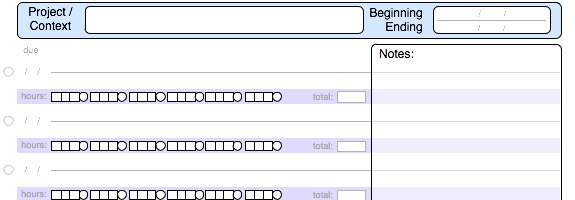 The header remains the same, but the prioritizing aspect of each task has gone away and been replaced with a due date. The hours are no longer tied to days since many tasks, at this level, will span days and are purely there for estimation purposes. You can fill in the hours boxes like a big horizontal thermometer. Alternately you can use it to estimate days. When the task is completed you can go back and fill in the “total” at the end to see how your estimates stood up against the time it actually took.