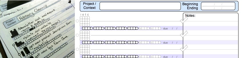 The header has a place for the project name or some other context that connects the tasks you are working on: “Project X”, “Homework”, “Enemies of the State”… stuff like that. And, if you’re the type who keeps your tasks lists around for a while there’s a place for the beginning and ending date of the project, or maybe just the dates you started and finished the tasks on the page; whatever works best for you. I usually use it to indicate what week the tasks were for. This can be useful if you need to go back and see what you did last week for a status report.